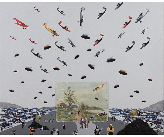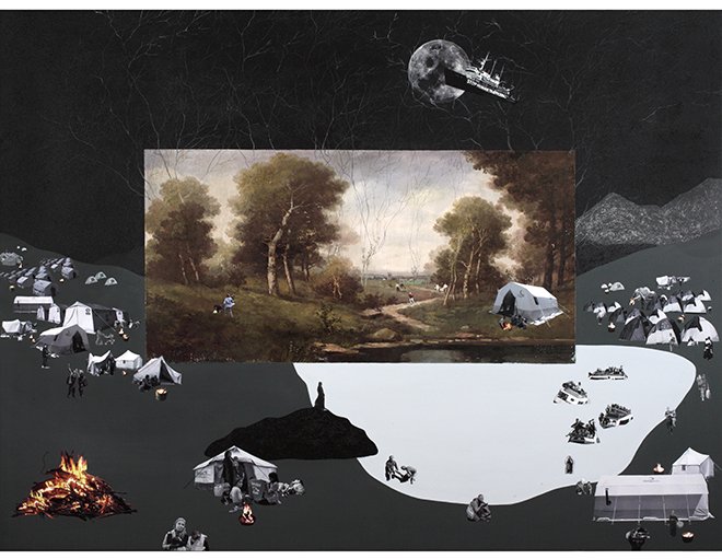 Sanatçının internetten ve basılı yayınlardan elde ettiği, sınırlar ve ulaşılan yeni topraklardaki insanlık hallerine dair görüntüler, düşsel ve aynı zamanda ideal olarak tanımlanan manzaraları merkezine aldığı resimlerin gerçeküstü sahneleriyle kaynaşıyor ve bizi insanlık durumlarına karşı sorularla baş başa bırakıyor.