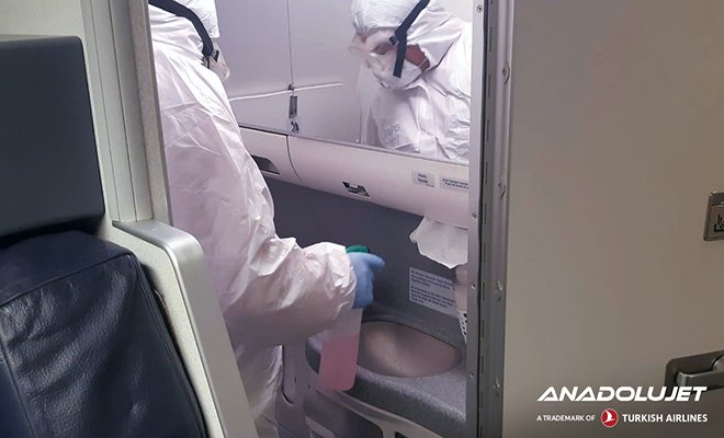 Standart temizlik ekiplerinin öncesinde dört kişilik özel hijyen ekibi uçağa girerek dezenfektan maddeler ile uçağı detaylı temizlik işlemine tabi tutmaktadır.